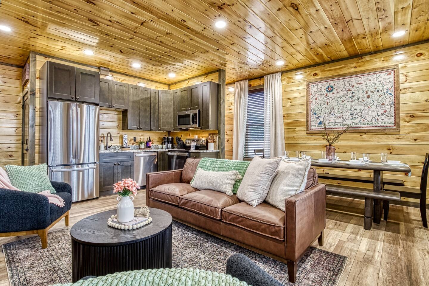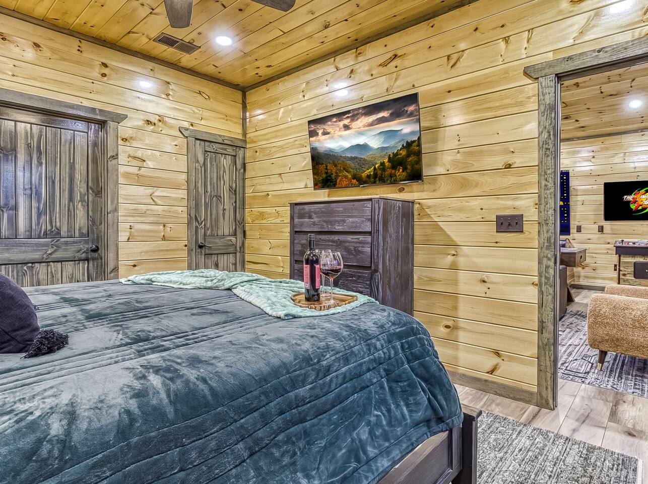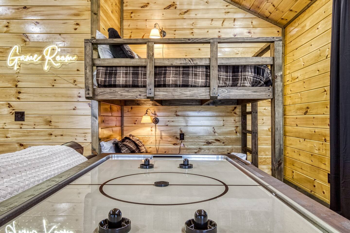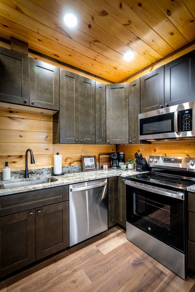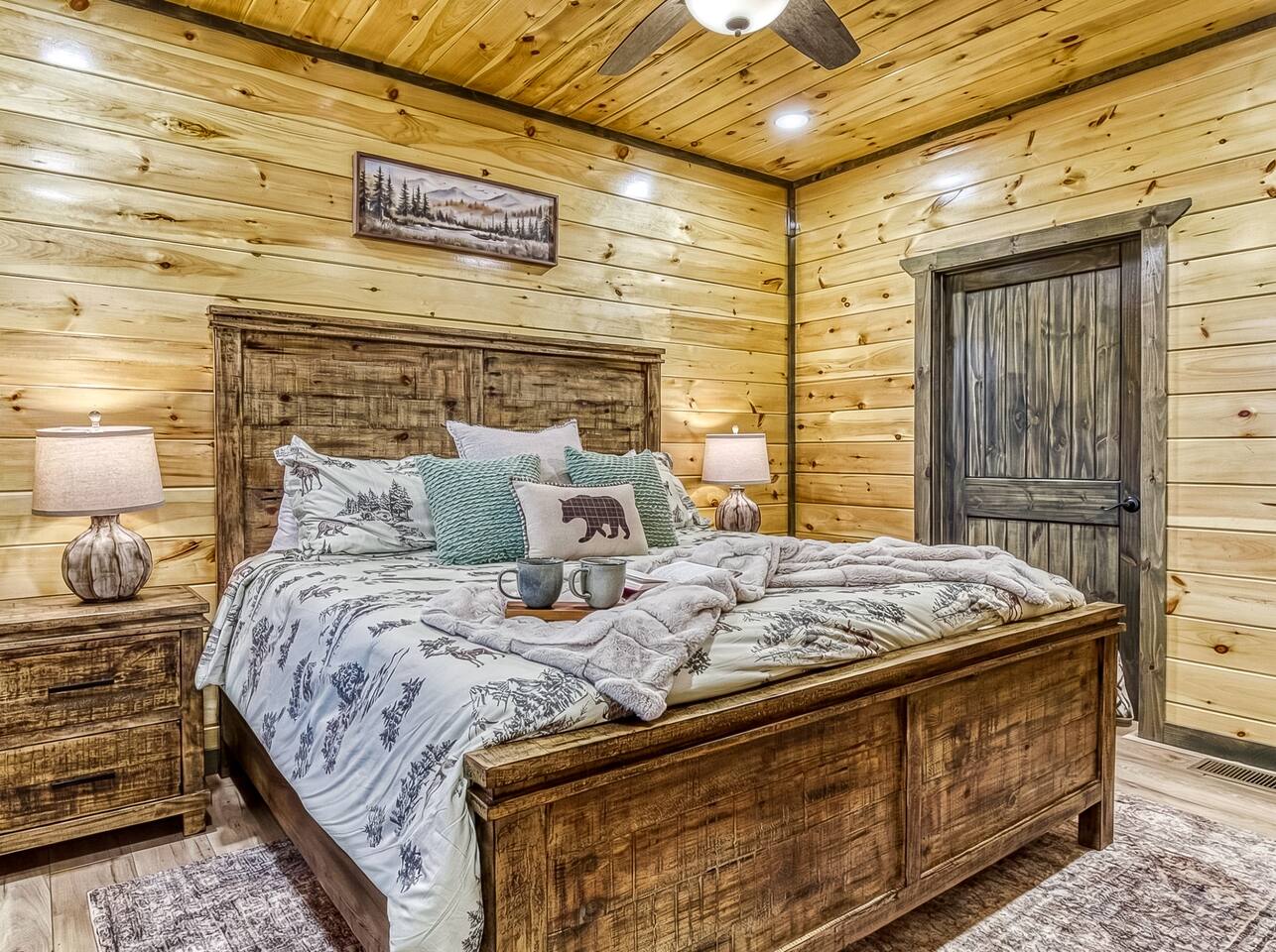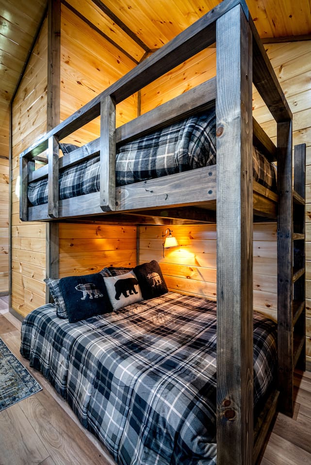 Cozy Bear Escape is the perfect mountain retreat for couples—whether traveling alone or with kids—as well as for two families looking to unwind and create unforgettable Smoky Mountain memories together. This upscale-yet-cozy 2-bedroom cabin sleeps up to 10 and is thoughtfully designed for couples, families, and group getaways alike. Conveniently located just 4 miles from Pigeon Forge and 11 miles from Gatlinburg, you’ll be close to top attractions while still enjoying peace, privacy, and wooded surroundings. The open-concept kitchen and living area provide a welcoming space for shared meals, games, and late-night conversations. At the end of the day, adults can retreat to comfortable private bedrooms, while kids enjoy their own upstairs living space complete with bunk beds, a game console, and an air hockey table—perfect for year-round fun, rain or shine. After a full day of hiking, shows, or theme parks, unwind on the deck with dinner, soak in the hot tub, gather around the fire pit with music, or enjoy a cozy movie night on the big screen. Every corner of Cozy Bear Escape is designed to strike the perfect balance between togetherness and privacy, offering a relaxing escape surrounded by Smoky Mountain charm. ________________________________________ Space Layout • 1,440 sq. ft. cabin with 2 bedrooms and 2 full bathrooms • Bedroom 1: King bed with an ensuite full bathroom, accessible from both the bedroom and common area • Bedroom 2: King bed with an ensuite full bathroom, accessible from both the bedroom and common area • Upstairs living area: Queen-over-Queen bunk beds • Additional sleeping: Queen sleeper sofa in the upstairs living area ________________________________________ Features & Amenities • Hot tub for relaxing after a day of adventure • Large Roku TV for movie nights or game day • Roku TVs in both bedrooms • Wood-burning fire pit out front (firewood not provided) • Large outdoor dining table to enjoy meals surrounded by nature • Drip coffee maker and Keurig (BYO coffee & K-cups) • Fully stocked kitchen cookware (BYO food & condiments)