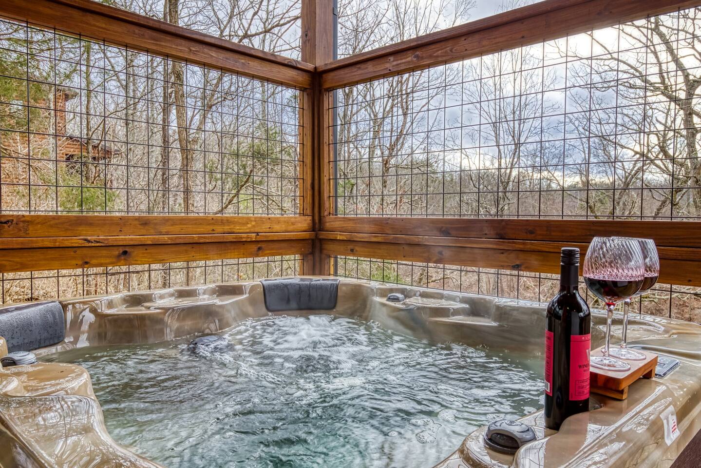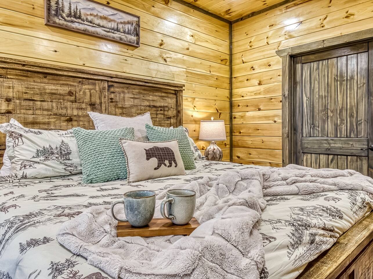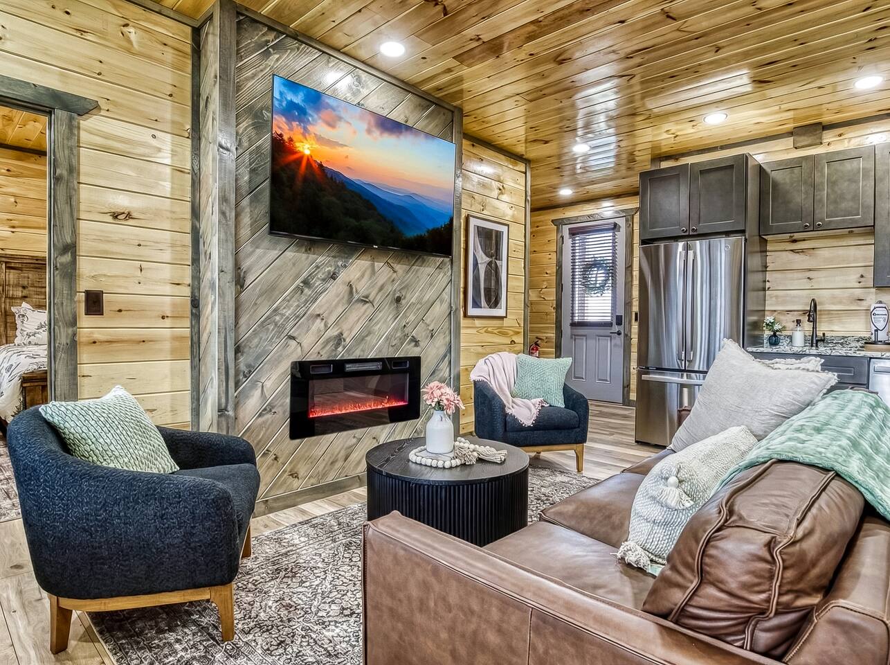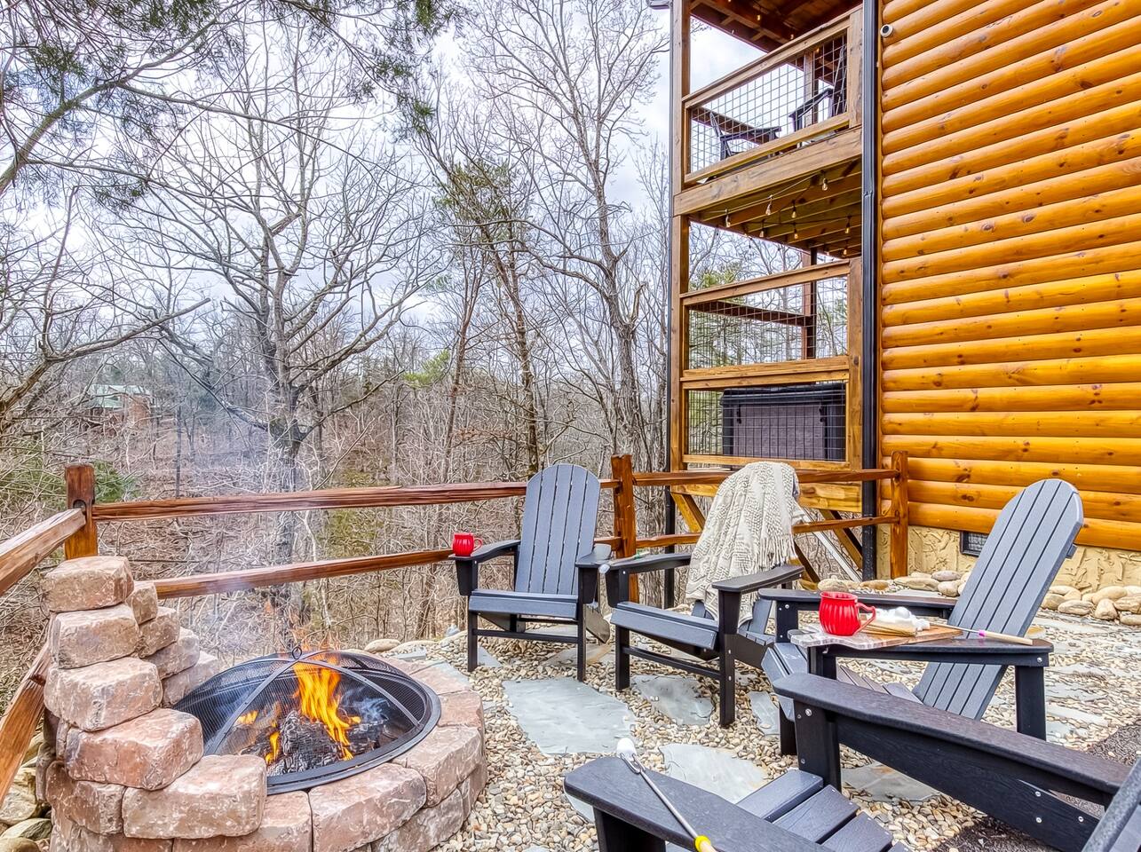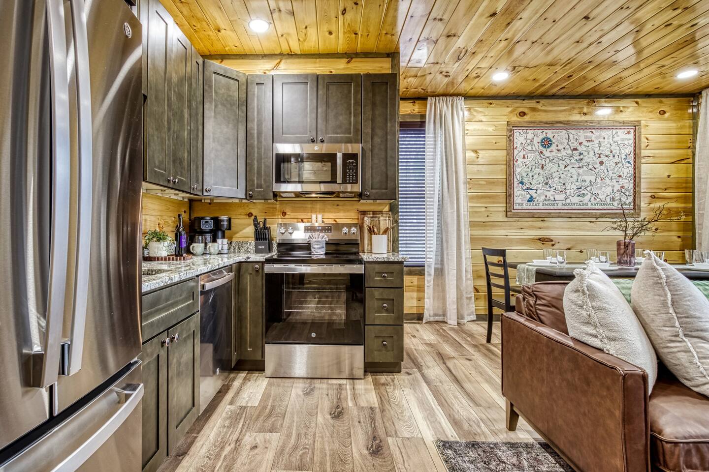 Cozy Bear Escape is the perfect mountain retreat for couples—whether traveling alone or with kids—as well as for two families looking to unwind and create unforgettable Smoky Mountain memories together. This upscale-yet-cozy 2-bedroom cabin sleeps up to 10 and is thoughtfully designed for couples, families, and group getaways alike. Conveniently located just 4 miles from Pigeon Forge and 11 miles from Gatlinburg, you’ll be close to top attractions while still enjoying peace, privacy, and wooded surroundings. The open-concept kitchen and living area provide a welcoming space for shared meals, games, and late-night conversations. At the end of the day, adults can retreat to comfortable private bedrooms, while kids enjoy their own upstairs living space complete with bunk beds, a game console, and an air hockey table—perfect for year-round fun, rain or shine. After a full day of hiking, shows, or theme parks, unwind on the deck with dinner, soak in the hot tub, gather around the fire pit with music, or enjoy a cozy movie night on the big screen. Every corner of Cozy Bear Escape is designed to strike the perfect balance between togetherness and privacy, offering a relaxing escape surrounded by Smoky Mountain charm. ________________________________________ Space Layout • 1,440 sq. ft. cabin with 2 bedrooms and 2 full bathrooms • Bedroom 1: King bed with an ensuite full bathroom, accessible from both the bedroom and common area • Bedroom 2: King bed with an ensuite full bathroom, accessible from both the bedroom and common area • Upstairs living area: Queen-over-Queen bunk beds • Additional sleeping: Queen sleeper sofa in the upstairs living area ________________________________________ Features & Amenities • Hot tub for relaxing after a day of adventure • Large Roku TV for movie nights or game day • Roku TVs in both bedrooms • Wood-burning fire pit out front (firewood not provided) • Large outdoor dining table to enjoy meals surrounded by nature • Drip coffee maker and Keurig (BYO coffee & K-cups) • Fully stocked kitchen cookware (BYO food & condiments)