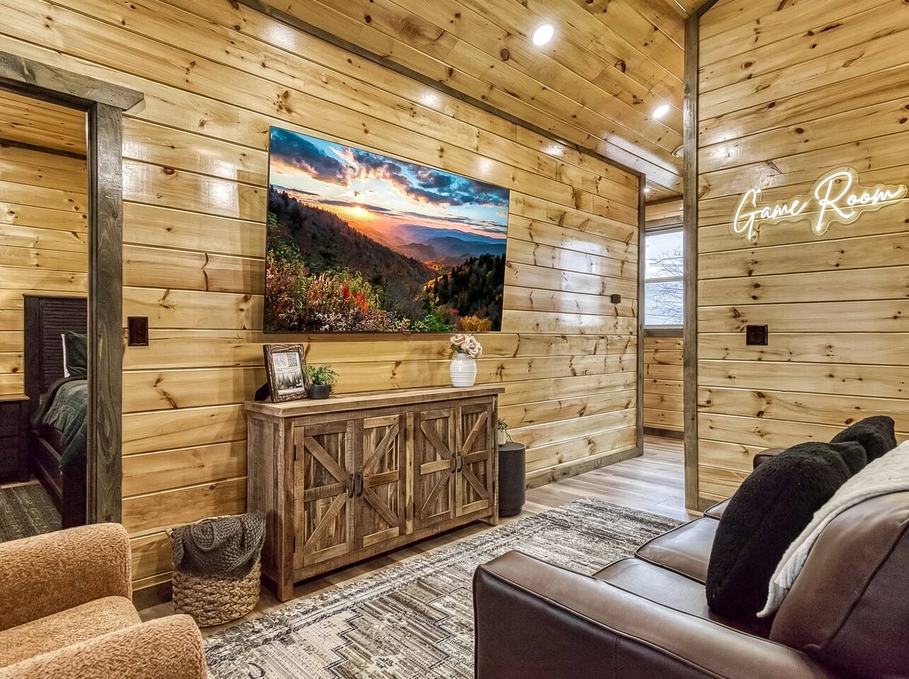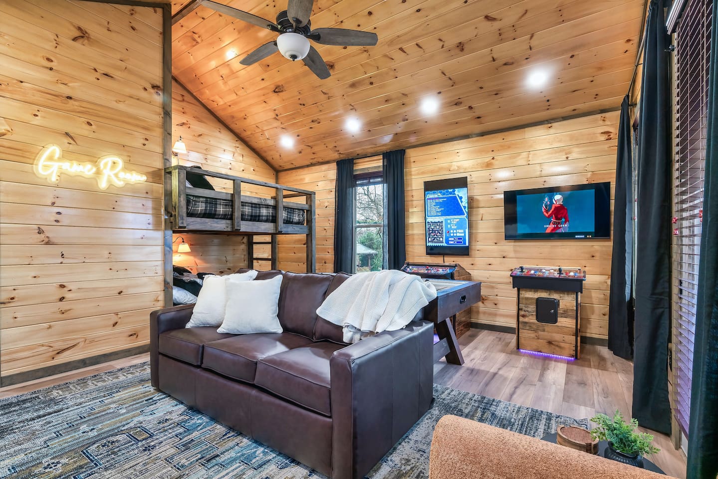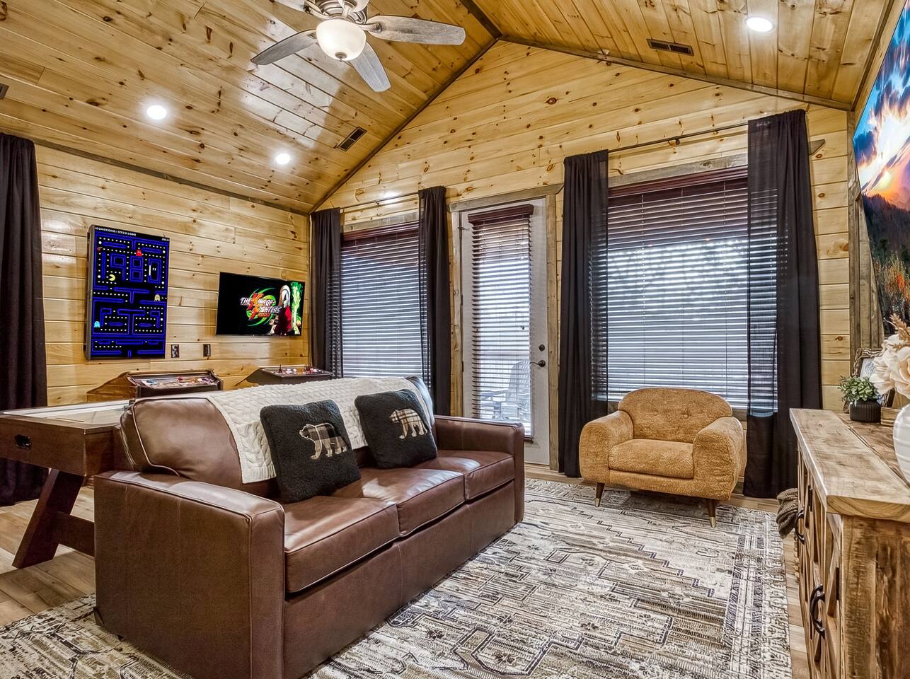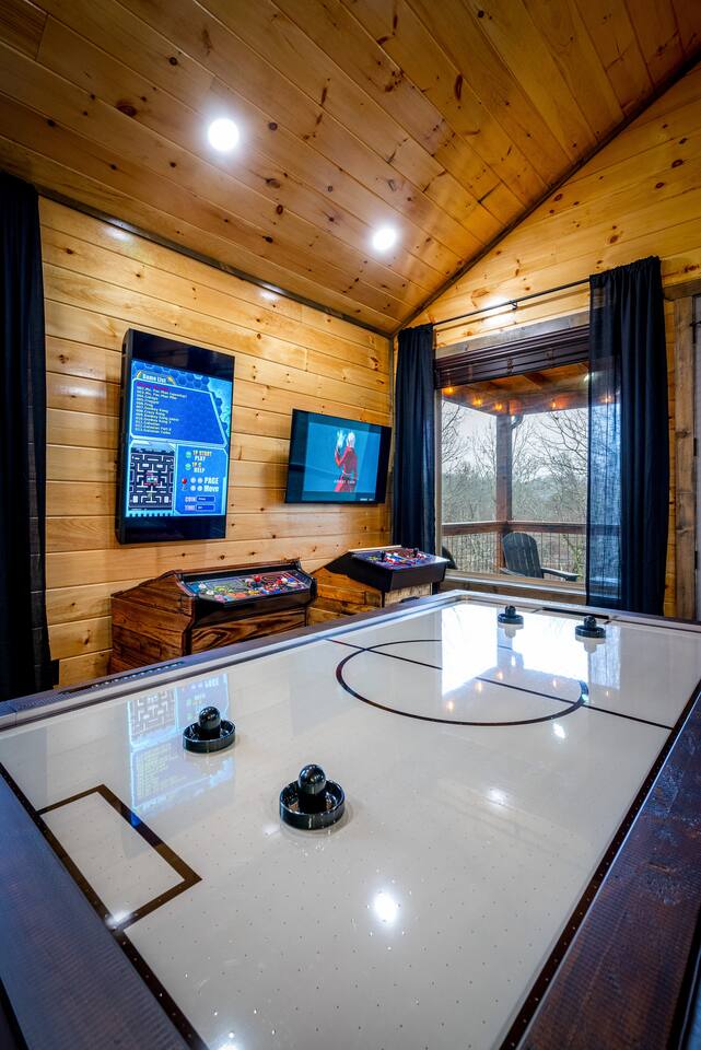 Escape to our 2-king suite, queen bunks Smoky Mountain cabin just 4 mi from Pigeon Forge and 11 mi from Gatlinburg. After days of adventure, soak in the private hot tub or gather by the wood-burning fire pit under the stars. Inside, enjoy an arcade with air-hockey & retro games, a fully stocked kitchen with Keurig & drip coffee, large Roku TVs, plus an EV charger and parking for 3 cars. Ready for mountain memories? Book your stay today!